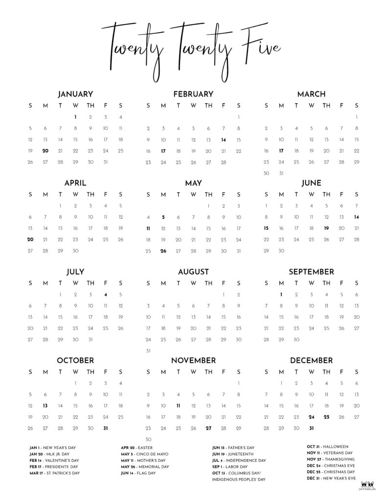 Printable Calendar 2025 One Page With Holidays Single Page 2025 Yearly Blank PDF Templates